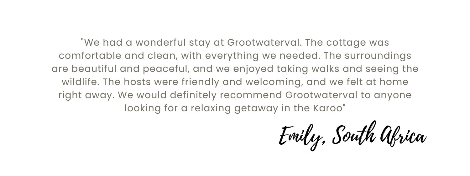 Welcome to Grootwaterval Farm, your perfect Karoo getaway located in the semi-arid Central Karoo, just 45km away from the charming village of Prince Albert in the Western Cape, South Africa. Our farm is an established sheep farm that has been in our family for generations, and we're excited to welcome you to our beautiful corner of the Karoo.